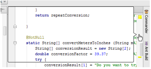 將鼠標指針懸停在滾動條之外的警告,錯誤條紋或滾動欄上的某些部分。IntelliJ IDEA 顯示了帶有警告/錯誤消息注釋的源代碼片段。