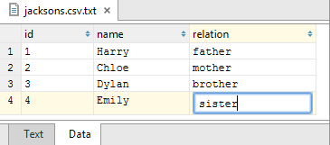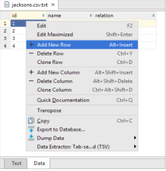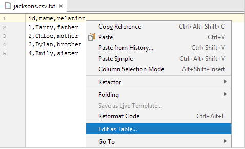 對于包含分隔符分隔值的文本文件(例如 CSV,TSV), IntelliJ IDEA 提供了一個替代的表編輯器。
