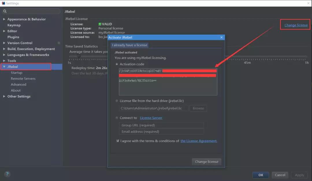 在設(shè)置里Jrebel里設(shè)置激活碼,如圖10.3,如果沒有安裝JRebel插件,先在Plugins里安裝搜索安裝JRebel插件。