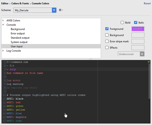 IntelliJ IDEA 使您能夠?yàn)楦鞣N類型的控制臺(tái)定義您習(xí)慣的配色方案。這樣做,您可以單獨(dú)配置各種控制臺(tái)輸出和用戶輸入。