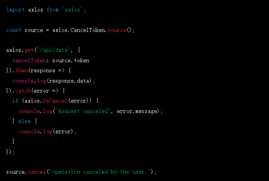 當(dāng)我們調(diào)用 source.cancel('Operation canceled by the user.') 時,請求將被取消。如果請求已經(jīng)發(fā)出,我們可以通過 axios.isCancel(error) 來檢查錯誤是否是取消的錯誤。
