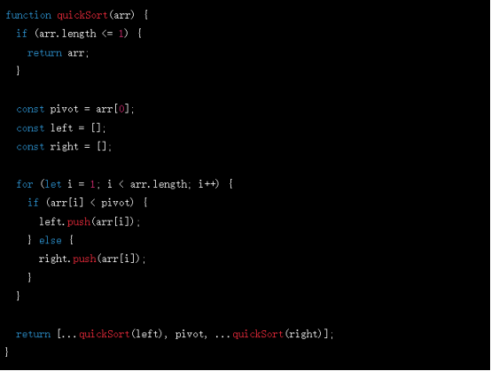 在這個示例中,quickSort函數(shù)接收一個數(shù)組參數(shù)arr,并返回一個排序后的數(shù)組。如果arr的長度小于等于1,則直接返回該數(shù)組。否則,選擇arr中的第一個元素作為基準元素pivot,并將小于pivot的元素放入一個新數(shù)組left中,將大于等于pivot的元素放入另一個新數(shù)組right中。然后,遞歸地對left和right數(shù)組進行排序,最后將left、pivot和right數(shù)組合并起來并返回。