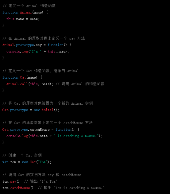 在上面的例子中,定義了一個 Animal 構(gòu)造函數(shù),該函數(shù)有一個原型對象,在其原型對象上定義了一個 say 方法。同時還定義了一個 Cat 構(gòu)造函數(shù),繼承自 Animal,并在其原型對象上定義了一個 catchMouse 方法。在創(chuàng)建一個 Cat 實例后,該實例可以訪問到其原型上的 say 方法,以及原型鏈上的 Animal 的屬性和方法。