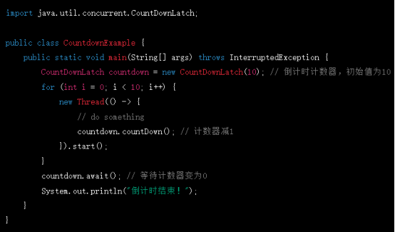 這里創(chuàng)建了10個(gè)線程,每個(gè)線程完成后調(diào)用countDown()方法將計(jì)數(shù)器減1,最后調(diào)用await()方法等待計(jì)數(shù)器變?yōu)?。當(dāng)計(jì)數(shù)器變?yōu)?時(shí),輸出"倒計(jì)時(shí)結(jié)束!"。