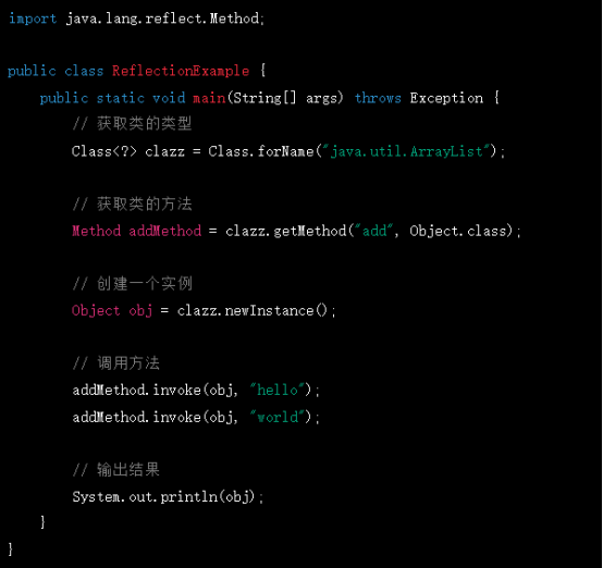 上述代碼中,首先使用Class.forName方法獲取了ArrayList類的類型,然后使用getMethod方法獲取了add方法的信息,接著創(chuàng)建了一個ArrayList的實例,并使用invoke方法調(diào)用add方法向其中添加元素。最后輸出了ArrayList的內(nèi)容。