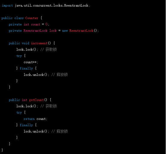 在上面的示例中,我們定義了一個(gè)Counter類(lèi),它包含一個(gè)計(jì)數(shù)器和一個(gè)可重入鎖。在increment()方法中,我們先獲取鎖,然后對(duì)計(jì)數(shù)器進(jìn)行自增操作,最后釋放鎖。在getCount()方法中,我們也先獲取鎖,然后返回計(jì)數(shù)器的值,最后釋放鎖。