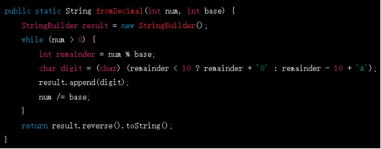 這個方法同樣接受兩個參數(shù),一個是要轉(zhuǎn)換的十進制數(shù),一個是目標(biāo)進制。它將十進制數(shù)不斷除以目標(biāo)進制,將余數(shù)轉(zhuǎn)換為對應(yīng)的數(shù)字或字母,然后將結(jié)果倒序拼接即可。