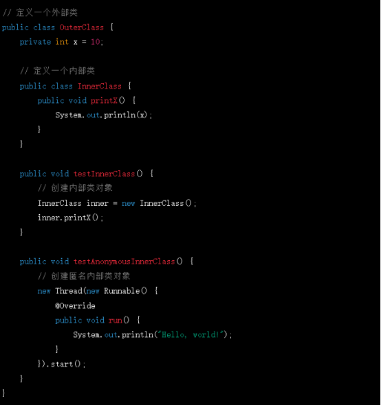 在上面的例子中,InnerClass是一個內(nèi)部類,它可以訪問外部類的私有屬性x;testInnerClass()方法中創(chuàng)建了一個內(nèi)部類對象,并調(diào)用了printX()方法。testAnonymousInnerClass()方法中創(chuàng)建了一個匿名內(nèi)部類對象,它實現(xiàn)了Runnable接口的run()方法,并在新線程中打印一條消息。