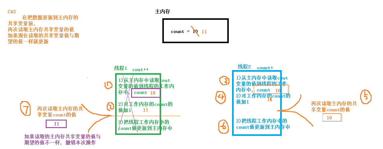 CAS原理:在把數(shù)據(jù)更新到主內(nèi)存時(shí),再次讀取主內(nèi)存變量的值,如果現(xiàn)在變量的值與期望的值(操作起始時(shí)讀取的值)一樣就更新。