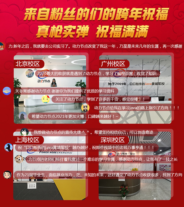 技能成就職業(yè),職業(yè)改變?nèi)松胀ㄈ讼胍幸环莺玫穆殬I(yè),就必須要有所選擇有所舍棄,12年來有太多人從零開始,放棄本專業(yè)、原工作,選擇來動力節(jié)點進(jìn)行Java培訓(xùn),為的就是搭乘互聯(lián)網(wǎng)發(fā)展快車,實現(xiàn)人生逆襲。作為Java職業(yè)教育機構(gòu),我們沒有理由不去擔(dān)起這份沉甸甸的信任。所以,動力節(jié)點自2009年辦學(xué)之始,一直專注Java教育培訓(xùn),將全部資源、精力”凝聚成山”為的就是真正保證教育質(zhì)量,做到教學(xué)出類拔萃,不負(fù)專業(yè)之名。而這份努力也得到了回響,學(xué)員口口相傳,口碑招生突破91%,先后獲得《CCTV影響力對話》欄目、中國教育電視臺欄目報道,被譽為“口口相傳的Java黃埔軍校”,而這其中學(xué)員的鼓勵和肯定,是激勵我們前行的最大動力!