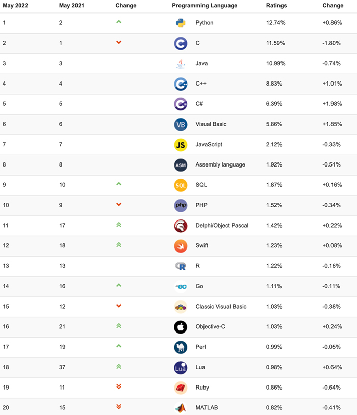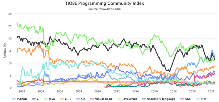 Top 10 編程語(yǔ)言 TIOBE 指數(shù)走勢(shì)(2002-2022)