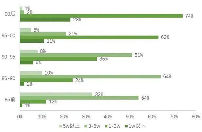 隨著工齡的增加,相應(yīng)的,程序員的薪資也會(huì)得到進(jìn)一步的提高,95年-00年出生的程序員中,21%的程序員月薪?jīng)_到3-5萬元。而大多晉升到管理層的86-90程序員們,薪資不少已經(jīng)達(dá)到了3-5萬元,33%的程序員月薪達(dá)到5萬元以上。