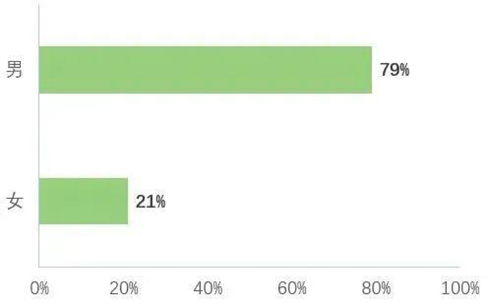 在程序員群體中,男性占比79%,女性占比21%,呈現(xiàn)出明顯的性別不平衡現(xiàn)象。