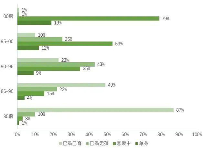 數(shù)據(jù)顯示,79%的00后程序員已經(jīng)脫單,在90-95年之間出生的程序員中,有66%的人處于戀愛或結(jié)婚狀態(tài)。有一半年齡在35歲左右的程序員已經(jīng)組建了美滿的家庭,擁有妻子和孩子。