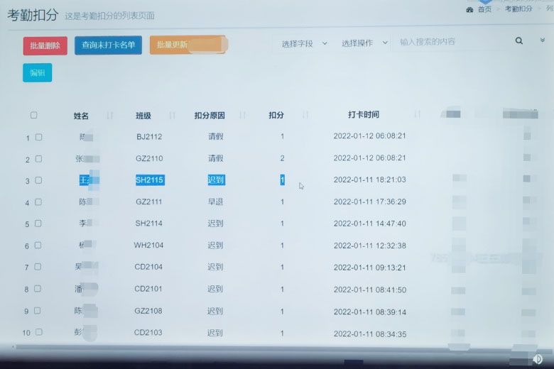 此外,各校區(qū)教務人員還會通過查看視頻監(jiān)控、現(xiàn)場巡班等,對學員的違紀情況進行記錄并錄入D9系統(tǒng),雙重保障確保校區(qū)良好的學習氛圍。