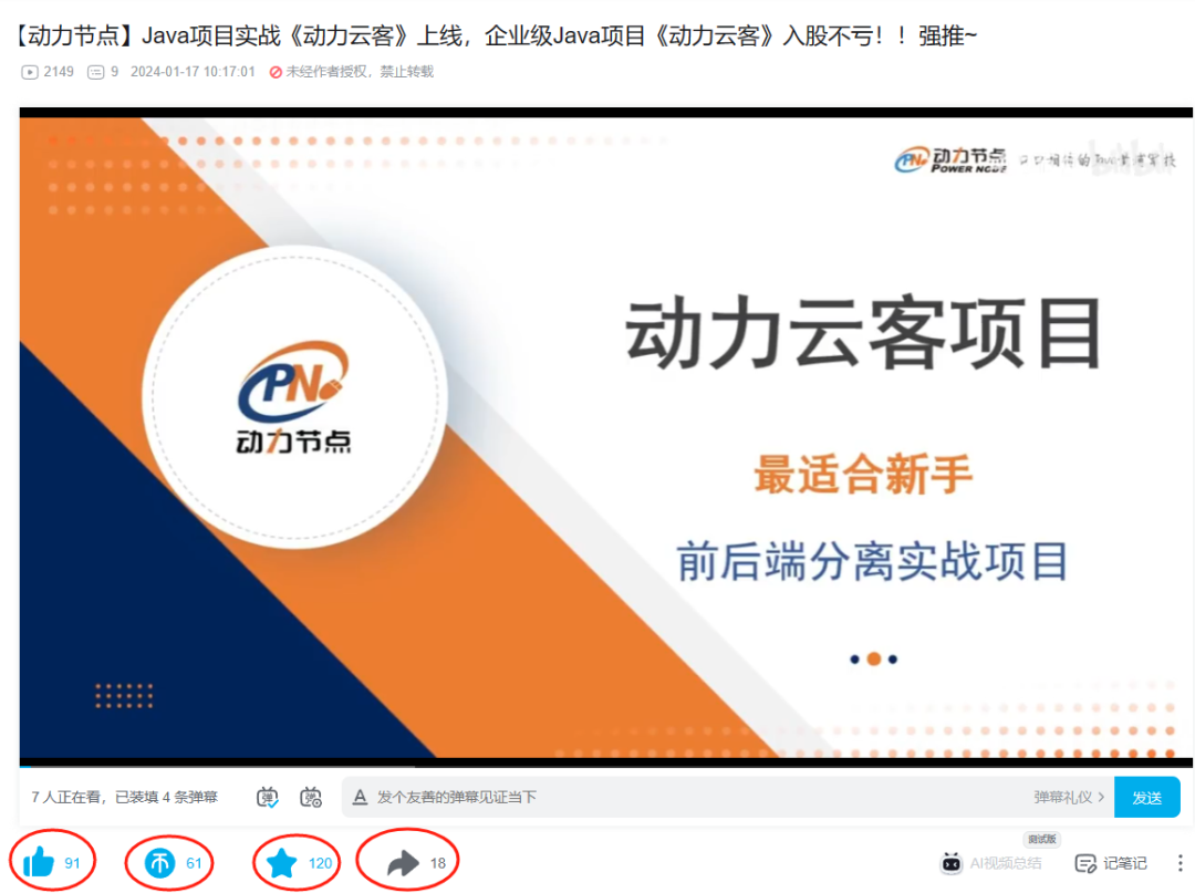 現(xiàn)在只要在動力節(jié)點嗶站“動力云客”項目下,一鍵四連(點贊、投幣、收藏、轉發(fā)),截圖加Javazx01,即可獲取積分50。