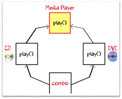 另一類“組合驅(qū)動器”繼承了 CD 和 DVD(見下圖)。它應(yīng)該繼承哪種播放方法?這可能會導(dǎo)致嚴(yán)重的設(shè)計問題。因此,Java 不允許多重繼承。