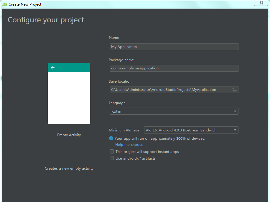 選擇Empty Activity點擊Next按鈕,出現(xiàn)下面的界面: