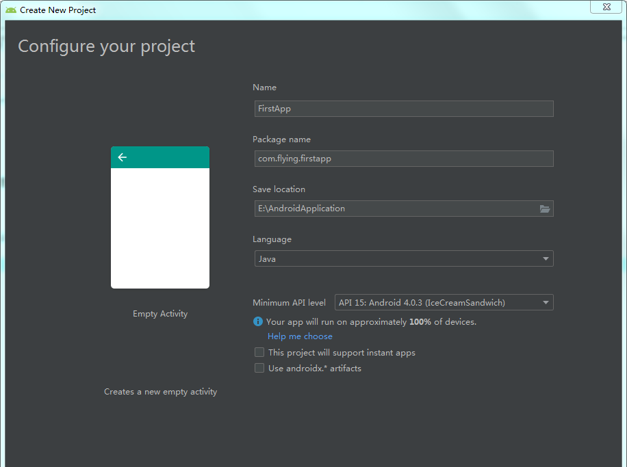輸入工程名稱FirstApp,選擇Java語言,其他基本上使用默認(rèn):