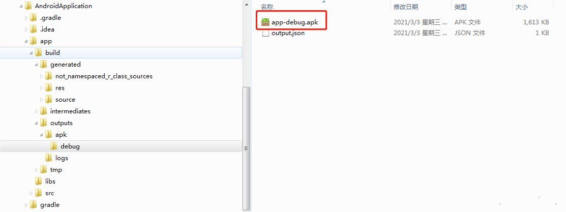點擊“Build|Make app…”菜單項,構(gòu)建成功,我們可以在目錄中找到生成的app-debug.apk文件: