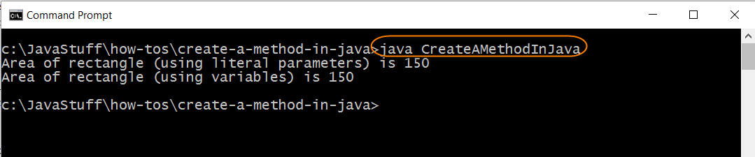 您編寫的方法名為computeAreaOfRectangle. 它接受兩個(gè)整數(shù)參數(shù)并返回一個(gè)整數(shù),即兩個(gè)參數(shù)的乘積。
