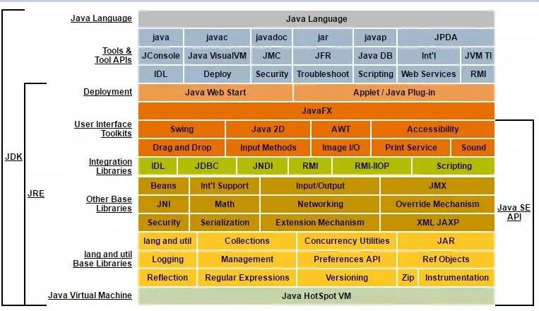 兩個(gè)常見的重要概念。其實(shí)上面的圖中已經(jīng)劃分出了JDK和JRE的范圍了。我們對這張圖做一個(gè)歸納,用我們的語言簡單地總結(jié)一下什么是JDK和JRE:
