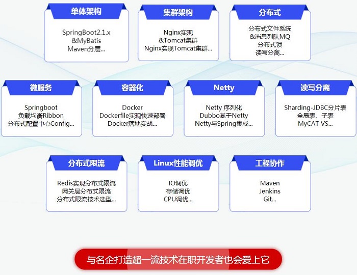 主流與前沿技術兼?zhèn)?,勢必非凡,無處不在的技術精髓,連在職開發(fā)者都被它吸引,華為 、阿里巴巴、 京東、 百度、 巨頭企業(yè)技術大集結,高薪基因淋漓詮釋。