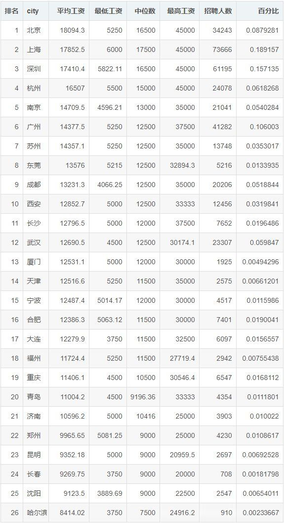 程序員收入排在前五的城市:北京18094.3元、上海17852.5元、深圳17410.4元、杭州16507元、南京14709.5元。