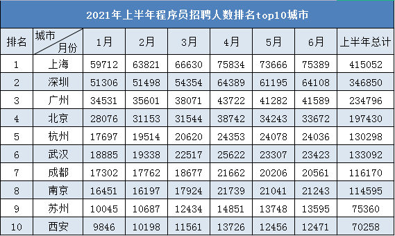 為了讓大家更加直觀地看到2021上半年各城市程序員的平均工資變化情況,小編將程序員平均工資排名前十的城市整理如下: