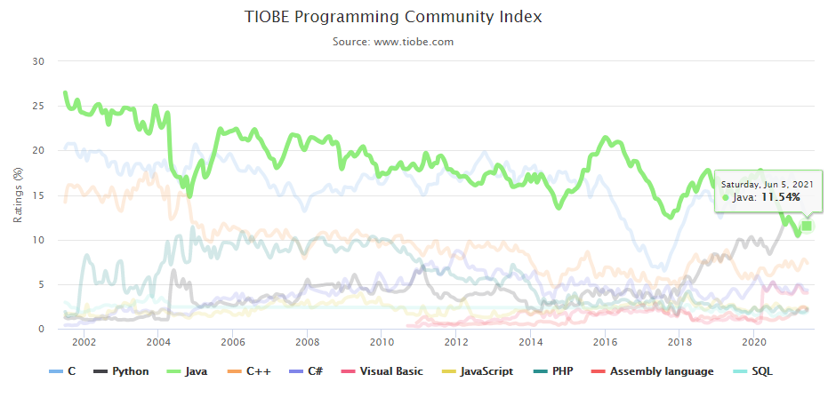 近年來Java語言在中國的市場份額持續(xù)攀升,目前以28.1%的市場份額穩(wěn)居第一。Java語言易上手、流行度廣,不易過時(shí)的優(yōu)勢讓越來越多的人選擇學(xué)習(xí)Java,從事Java開發(fā)工作。