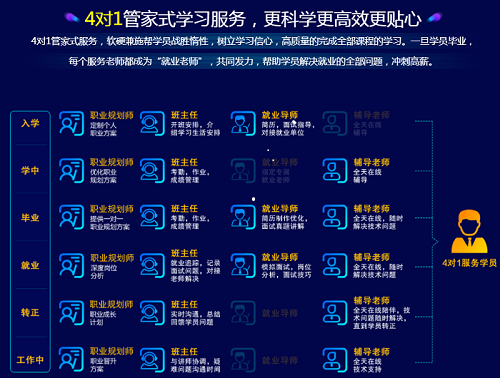 學(xué)習(xí)服務(wù):班主任(負(fù)責(zé)日常學(xué)習(xí)遇到的問題)、助教(負(fù)責(zé)自習(xí)答疑)、講師(授課、答疑)、就業(yè)指導(dǎo)老師(為學(xué)員提供1:1專業(yè)的簡(jiǎn)歷、面試等就業(yè)指導(dǎo)幫助學(xué)員快速就業(yè))全程4:1管家式教學(xué),從學(xué)員入學(xué)到就業(yè)為學(xué)員提供一站式教學(xué)服務(wù)。