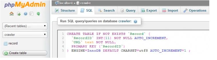 創(chuàng)建一個名為“Crawler”的數據庫并創(chuàng)建一個名為“Record”的表,如下所示: