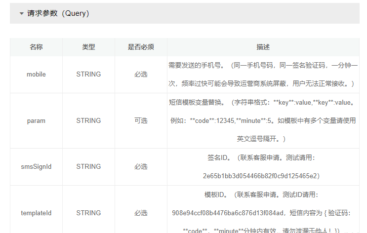 實(shí)現(xiàn)Java手機(jī)驗(yàn)證碼發(fā)送功能?動(dòng)力節(jié)點(diǎn)小編告訴大家,首先我們需要找一個(gè)提供短信服務(wù)的商戶(hù),隨便在哪里找都一樣,購(gòu)買(mǎi)商家的短信服務(wù)后會(huì)拿到一些參數(shù),比如說(shuō)請(qǐng)求地址,請(qǐng)求方式,token等,如下圖所示: