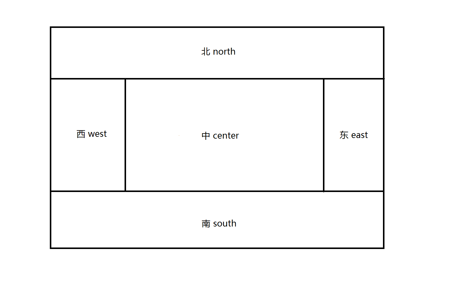 BorderLayout 邊框布局。把容器分為上北下南左西右東中間五個部分,這五個部分的組成如下:
