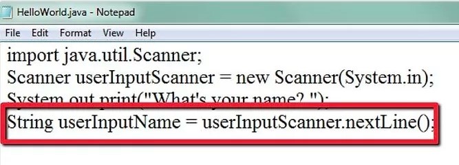 5.讓 Scanner 對(duì)象接收用戶輸入的下一行并將其存儲(chǔ)在變量中。Scanner 將始終獲取有關(guān)用戶輸入內(nèi)容的數(shù)據(jù)。以下行將要求 Scanner 獲取用戶輸入的內(nèi)容作為他或她的姓名并將其存儲(chǔ)在Java變量中: