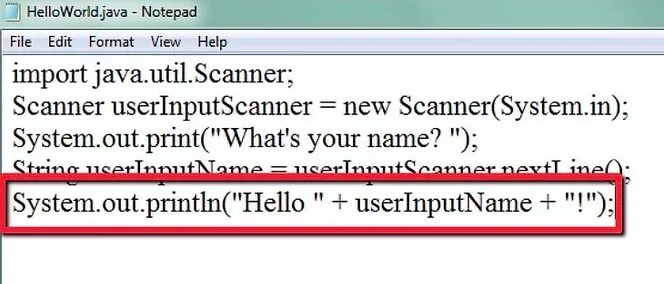 系統(tǒng)。出來(lái)。println ( "你好 " + 用戶輸入名稱 + “!” );