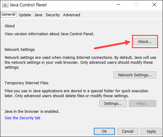 3. Java 控制面板打開后,單擊關(guān)于按鈕。應(yīng)該會(huì)出現(xiàn)一個(gè)包含 Java 版本信息的新窗口。