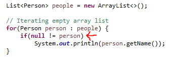 雖然預(yù)防是好的,但過度預(yù)防是不行的。為了避免 NullPointerException,有時開發(fā)人員傾向于在“for-each”循環(huán)中對每一個內(nèi)容進行空值檢查。但是沒有必要檢查循環(huán)內(nèi)的空值。“for-each”循環(huán)僅在列表中存在元素時迭代??聪旅娴睦觼泶_認: