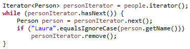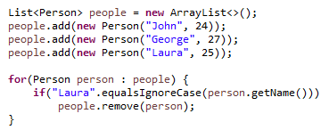 從中刪除一個人。如果我們運行此代碼,將引發(fā)并發(fā)修改異常。為了解決這個問題,有多種方法可用。首先,收集對象并在另一個循環(huán)中刪除它們。或者你可以使用 Iterator.remove() 方法。
