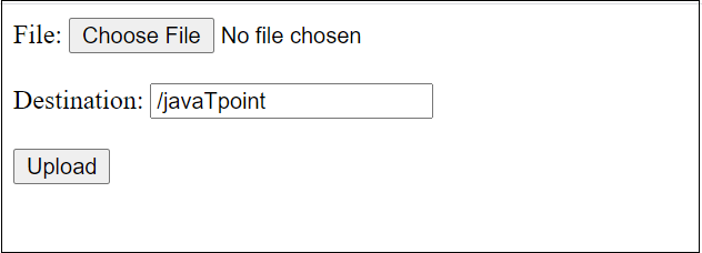 輸入 URL 并按回車鍵后,將打開我們在上面創(chuàng)建的 HTML 表單。我們?yōu)g覽系統(tǒng)并選擇一個文件將其上傳到所需位置。在目標字段中,我們輸入需要存儲該文件的目錄的路徑。該目錄應該已經(jīng)在系統(tǒng)中創(chuàng)建并且必須是可寫的。如果我們沒有為目標字段設置任何內容并單擊上傳按鈕,它將引發(fā)異常。