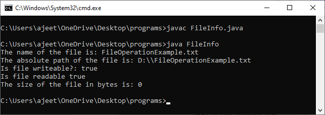 執(zhí)行該操作以獲取文件信息。我們使用幾種方法來獲取有關(guān)文件的信息,例如名稱、絕對路徑、可讀性、可寫性和長度。