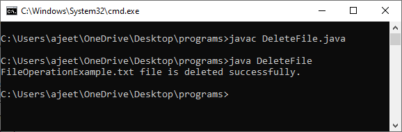 我們可以對文件執(zhí)行的下一個操作是“刪除文件”。為了刪除文件,我們將使用文件的delete()方法。我們不需要使用close()方法關(guān)閉流,因為要刪除文件,我們既不使用 FileWriter 類,也不使用 Scanner 類。