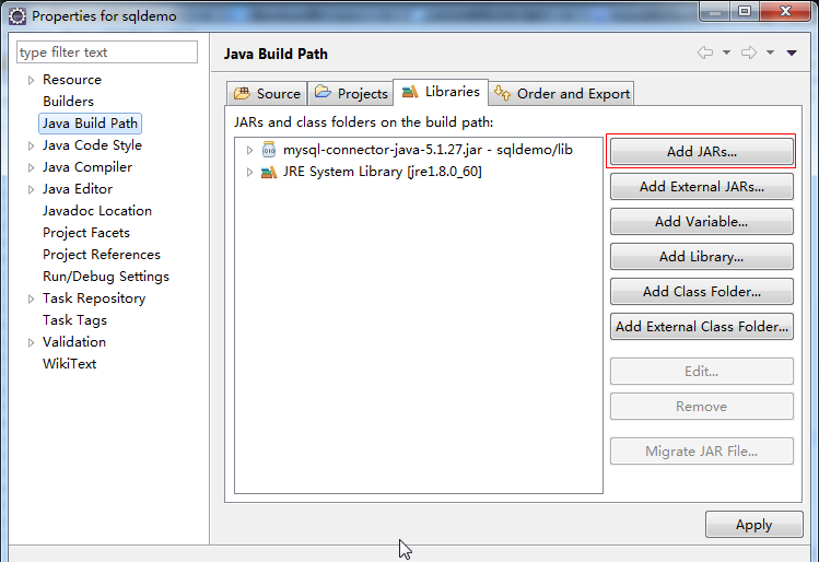 右鍵工程名,在java build path中的Libraries分頁中選擇Add JARs...,選擇剛才添加的JDBC,如下圖: