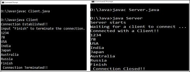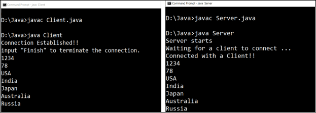 1234, 78, ..., Russia 是客戶端發(fā)送的輸入。這些輸入消息在服務(wù)器端顯示。要終止連接,我們必須輸入單詞 Finish。