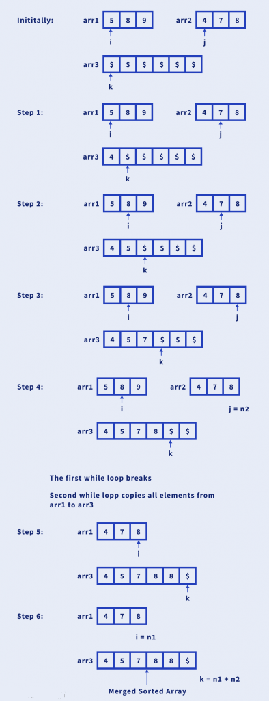 使用指針同時遍歷兩個數(shù)組,并在兩個數(shù)組中選擇最小的元素并插入到輔助數(shù)組中。