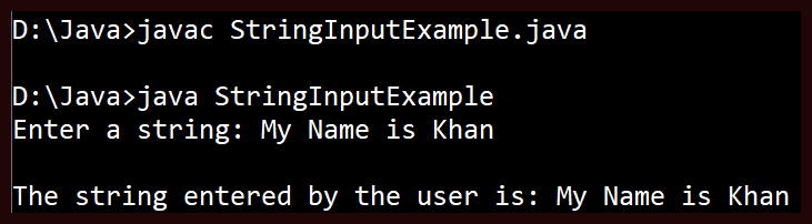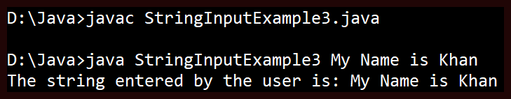 說明:顯示Enter a string消息后,光標在控制臺上等待用戶輸入字符串。nextLine()方法讀取直到用戶點擊回車并返回讀取的內(nèi)容,這些內(nèi)容由變量str捕獲。輸出中顯示了相同的讀取字符串。請注意,點擊回車按鈕表明該行已終止。