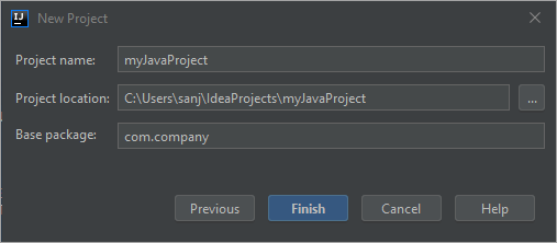 4.在下一個屏幕中,您可以指定項目名稱、位置目錄和包名稱。