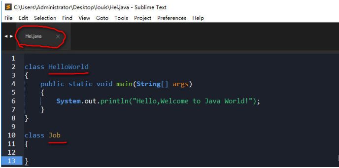 最后,在 Hei.java 源文件中定義一個(gè) HelloWorld 和 另外一個(gè)類(lèi) Job,文件名為 Hei,