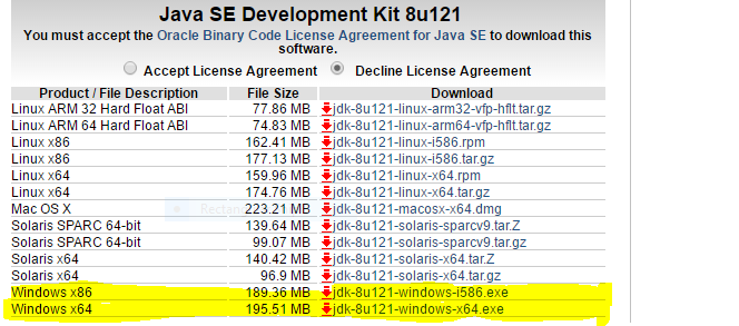 第 1 步: Java8 JDK 可在下載 Java 8中獲得。單擊 Windows(32 位)的倒數(shù)第二個鏈接和 Windows(64 位)的最后一個鏈接,如下所示。
