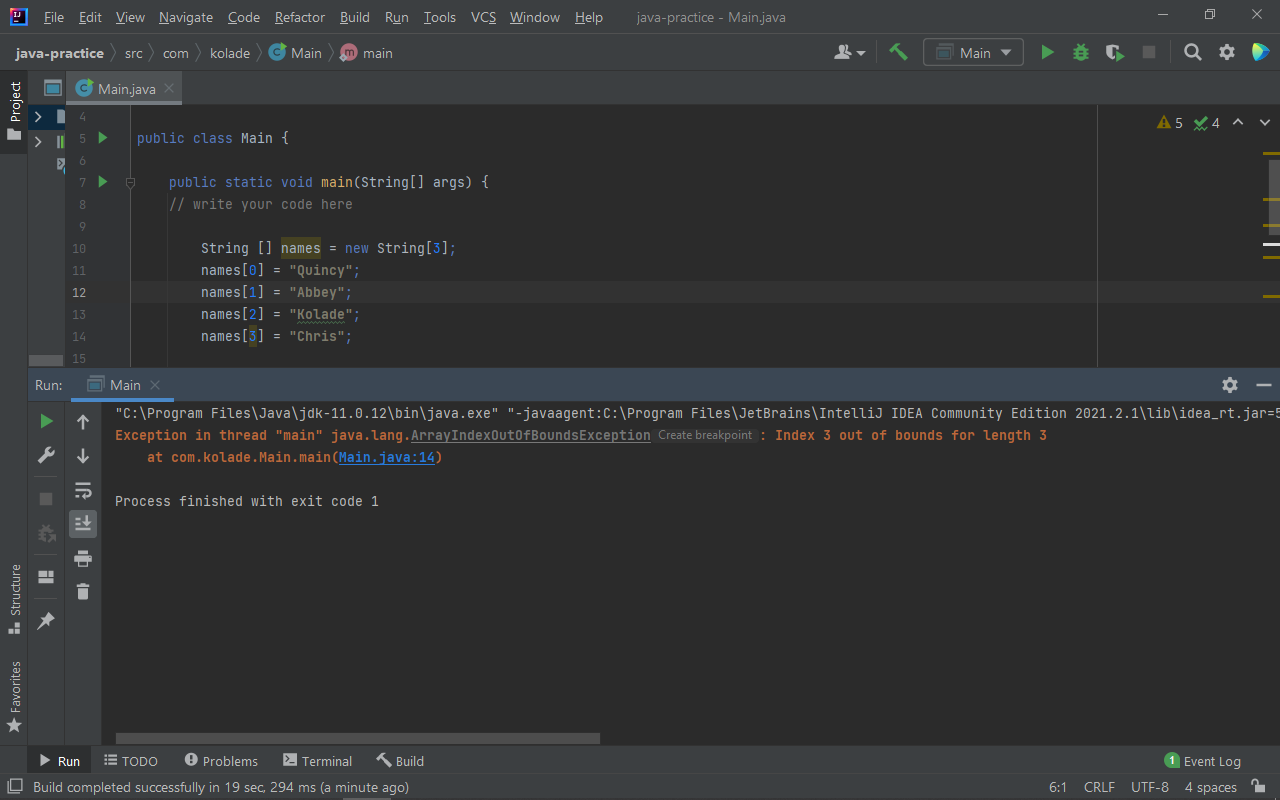 在上面的代碼片段中,我初始化了一個名為名稱(標識符)的字符串數(shù)組。大小為 3,因此它只能容納三個值。